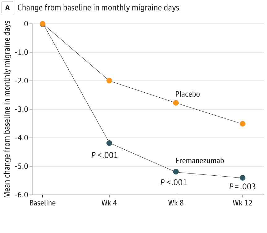 - 8週以降は差が安定し、フレマネズマブ群では平均9日前後まで低下。