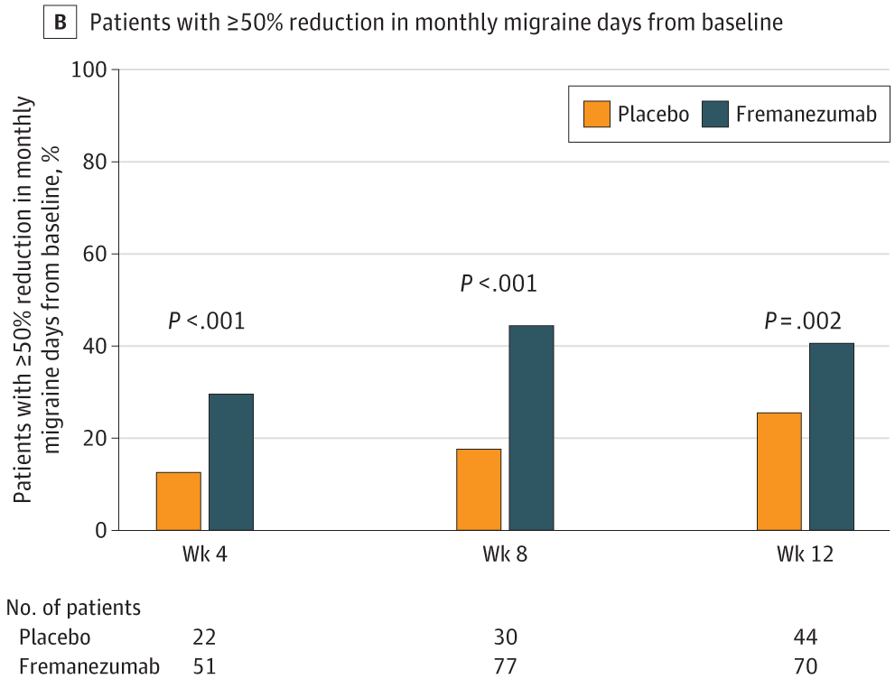 ベースラインからの月間偏頭痛日数の変化とベースラインからの月間偏頭痛日数の50%以上の減少を示す患者(第4週、第8週、第12週)